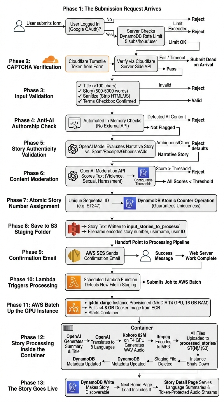 The separation is intentional. Keeping the GPU work off the web server means the always-on instance stays cheap and predictable. Keeping the submission validation on the web server means stories are screened before they ever enter the processing queue, so the GPU compute is only spent on content that has already cleared all quality and moderation gates.
