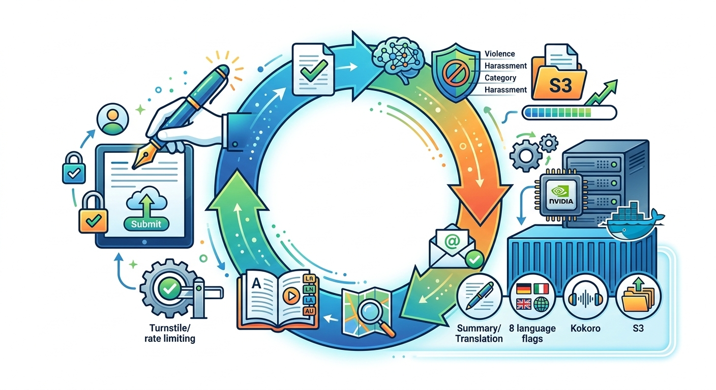 AI & Machine Learning: AI does the heavy lifting. OpenAI (GPT-5-Nano & Moderation APIs) handles spam filtering, content moderation, language validation, summarization, and translation. Kokoro 82M (an open-source TTS model) runs locally to generate high-quality audio without expensive cloud TTS fees.