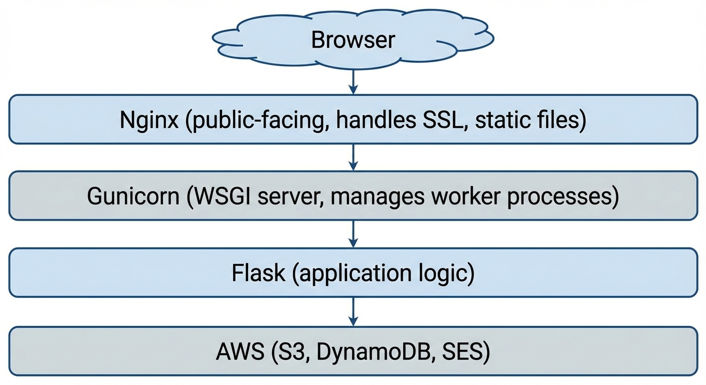 Always-On Web Server (t2.micro): Handles the Flask web app, routing, user sessions, and API requests via Nginx and Gunicorn.