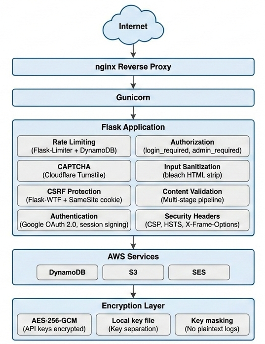 Security: Built with a “fail-secure” philosophy. Zero hardcoded secrets (all API keys are AES-256-GCM encrypted in DynamoDB), strict Google OAuth authentication, Cloudflare Turnstile (CAPTCHA), token-gated audio streaming, CSRF/XSS protection, and multi-layered rate limiting.