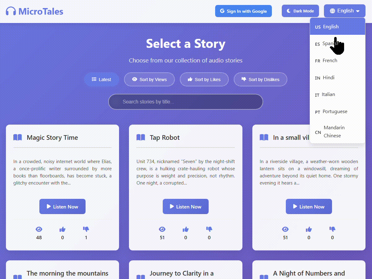 The idea of my little app came around when I had a book I was interested in but did not have the an audio version of it. Sure I would just give it to any of the top text to speech models and say go, then I thought, if I had this issue I’m sure other would also. And what if someone wanted to listen to the same story but in another langue. Well that is how MicroTales was born. A platform where people can submit stories they wrote. Then not only have it converted into audio, but in multiple languages as well.