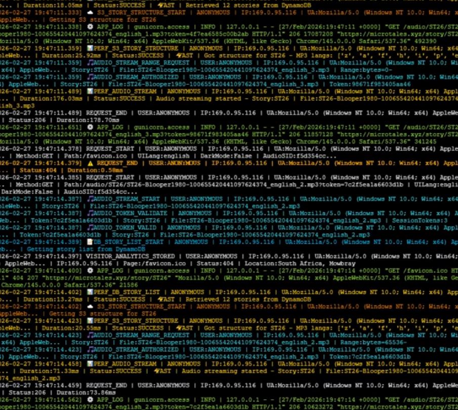 MicroTales has a layered logging system that handles everything from individual HTTP requests to long-term visitor analytics. It is not a single logger pointed at a file. It is a pipeline: logs are written to disk, periodically archived to S3, then processed hourly by two separate analytics pipelines that push structured data into DynamoDB. A parallel system monitors server health independently. All of this runs continuously in the background while the application serves requests.